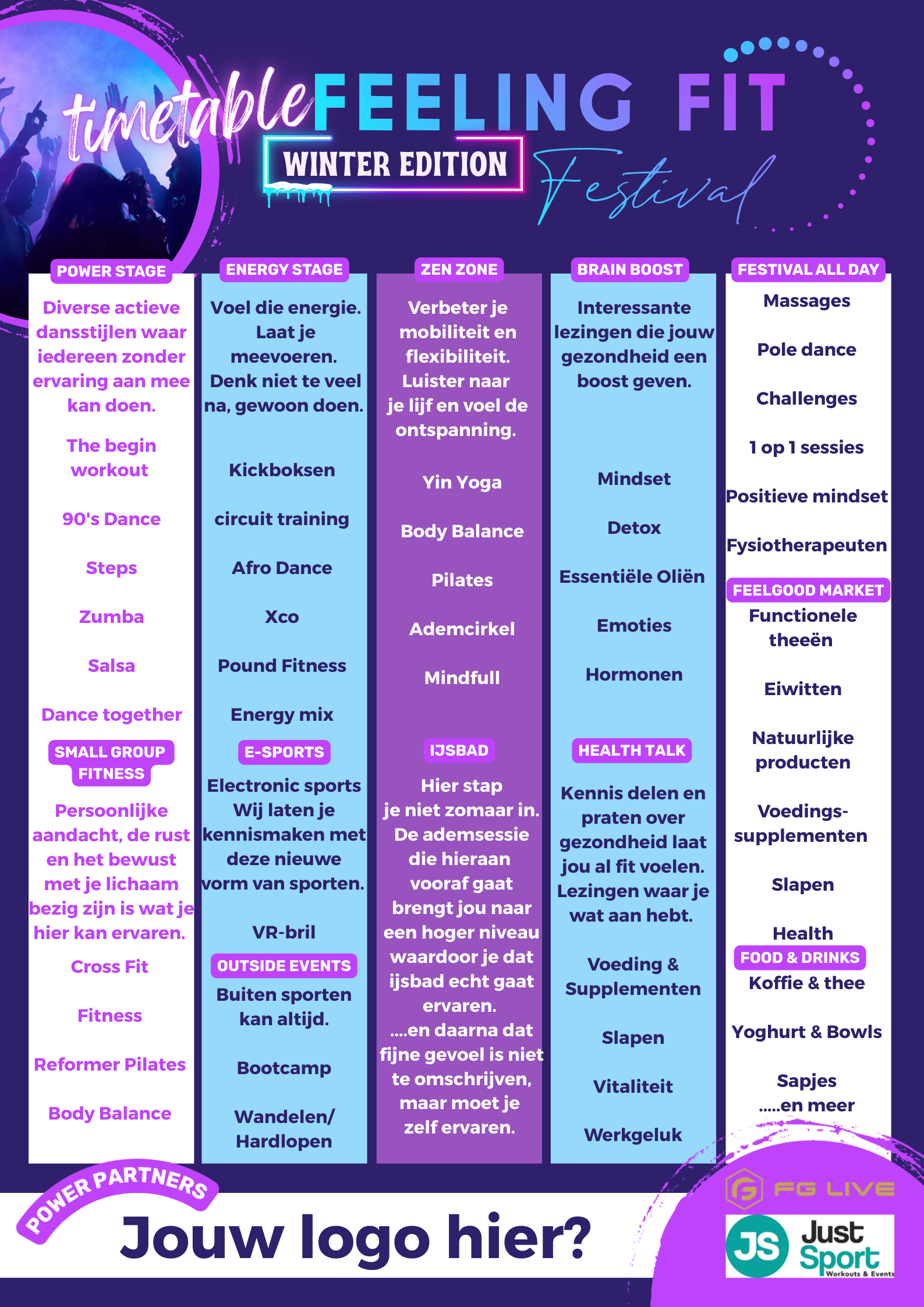 Wat begon als een idee vanuit passie voor sport, vitaliteit en gezondheid, is uitgegroeid tot een uniek festivalconcept dat inmiddels meerdere succesvolle buiten edities in Schagen en Hoorn heeft neergezet. Melissa en Monique de drijvende krachten achter deze edities bundelen nu hun krachten met Dennis van FG Live en Leonie Gooijer van Just Sport om de eerste Winter Edition neer te zetten.